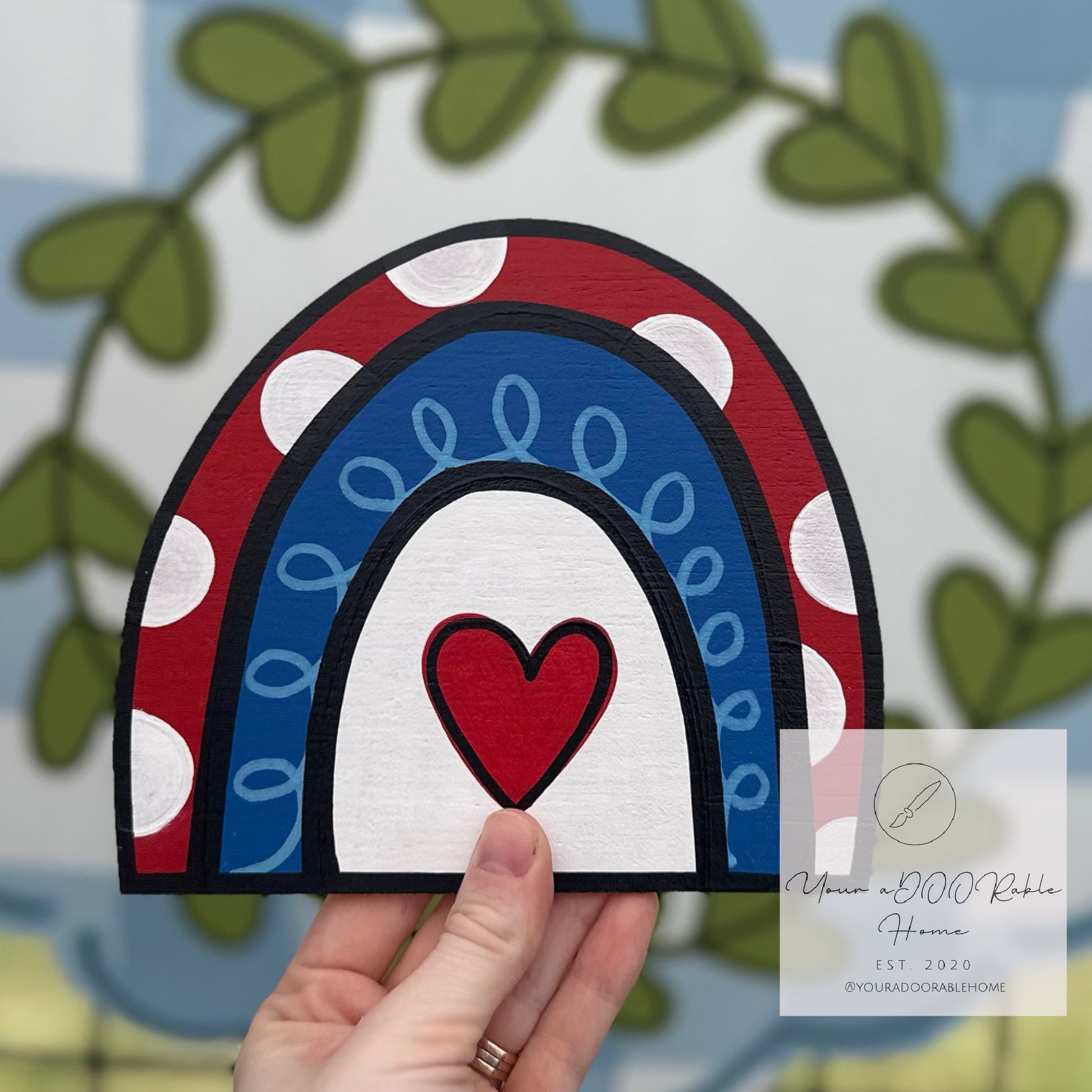 This attachment is cut out of 1/4 inch plywood and then painted with acrylic paint. Next we spray it with a clear sealer that helps prevent chipping, fading, and yellowing. We also use industrial strength velcro to adhere the attachment to the door hanger. All of our products are hand painted by me or my husband, so there could always be slight variations. This listing is made for the attachment only. There is a separate listing for the door hanger base.