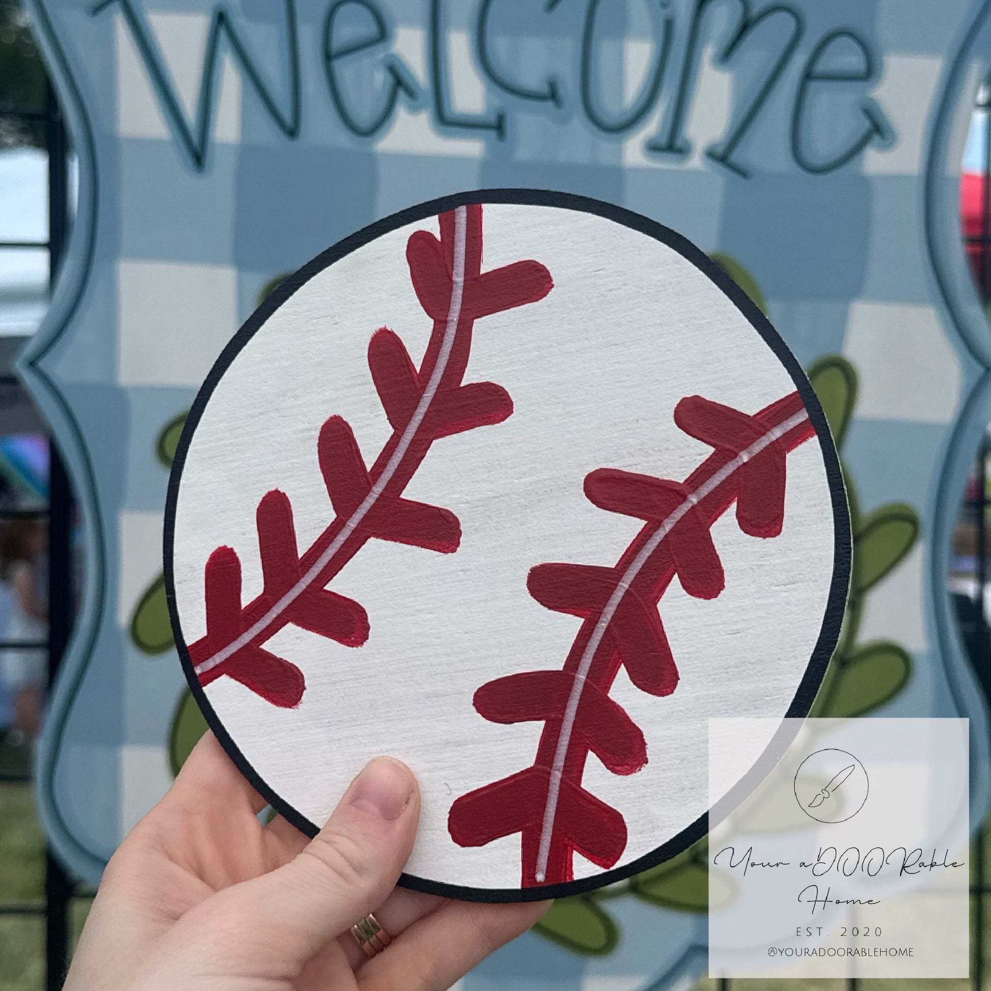 This attachment is cut out of 1/4 inch plywood and then painted with acrylic paint. Next we spray it with a clear sealer that helps prevent chipping, fading, and yellowing. We also use industrial strength velcro to adhere the attachment to the door hanger. All of our products are hand painted by me or my husband, so there could always be slight variations. This listing is made for the attachment only. There is a separate listing for the door hanger base.