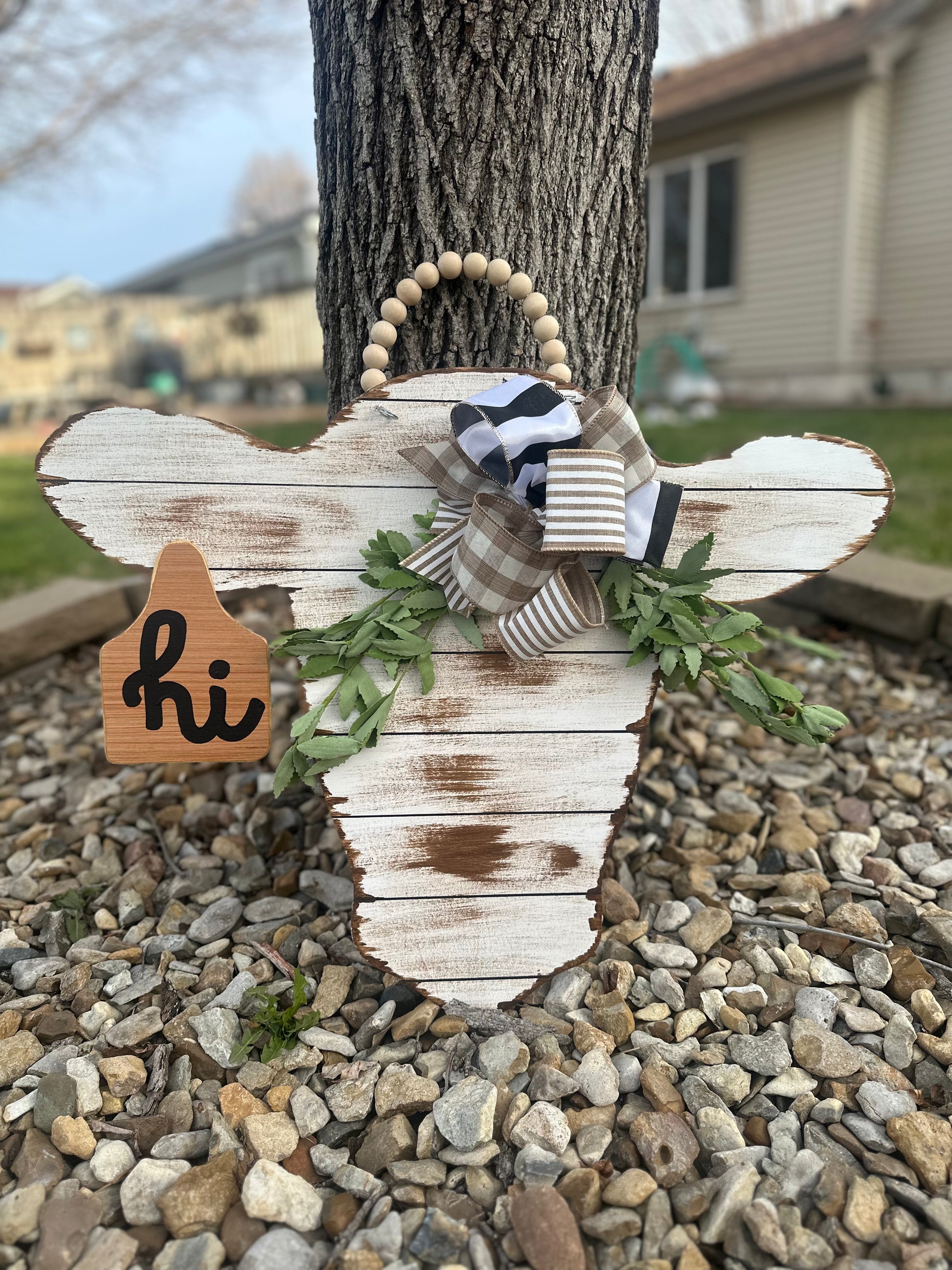 Our door hangers are cut out of 1/4 Birch with a jig saw. We then go in and sand all the edges to smooth them out. We will then paint with our acrylic paints, and add any final details. After that, we will go in and seal the door hanger to prevent chipping, fading, yellowing or peeling. We will then go in and add the wire to the door hanger and accessorize with a cute bow to match! This one also gets greenery!