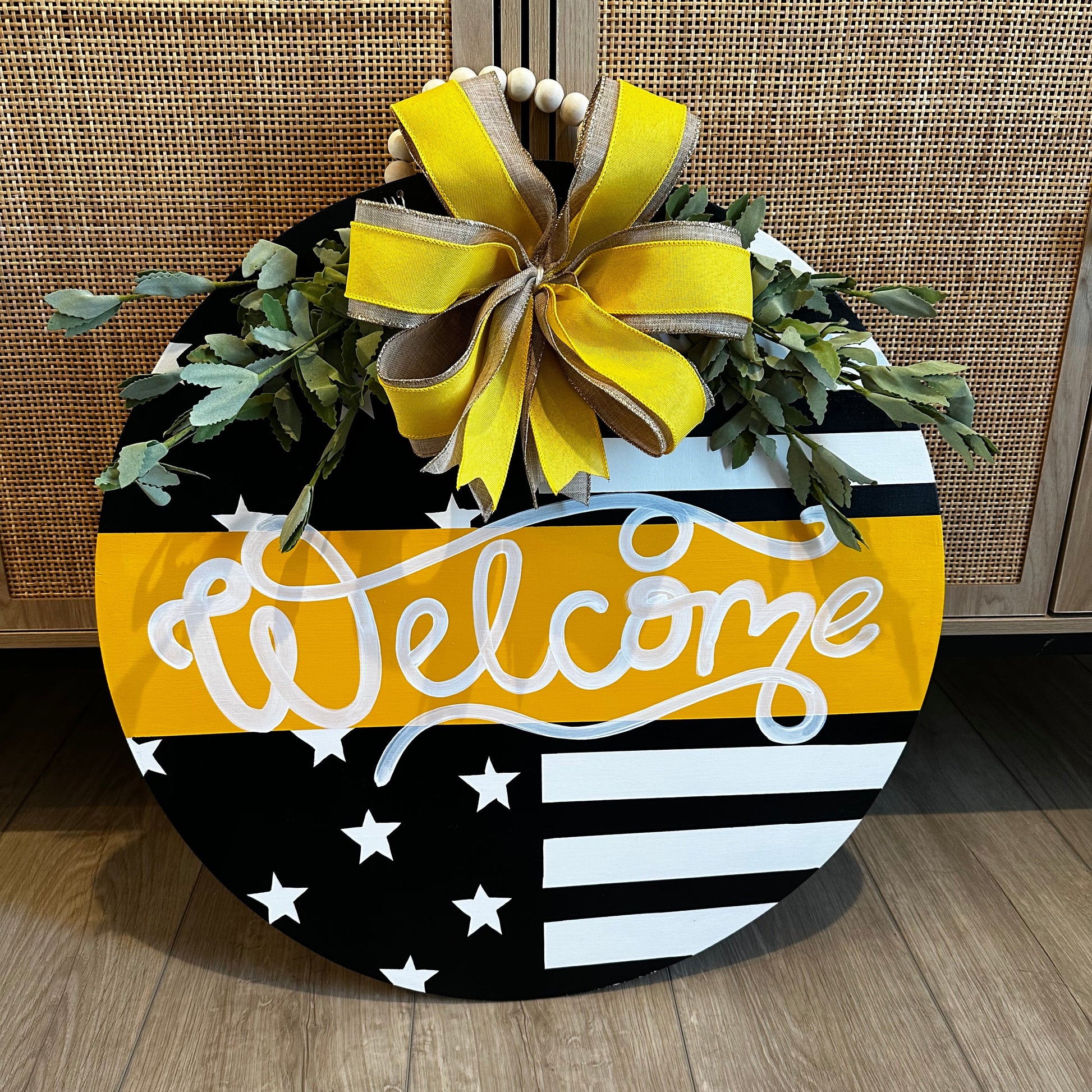 All door hangers are completely hand painted by my husband or I, so there could be very slight variations with what you see here and your actual door hanger that you receive.