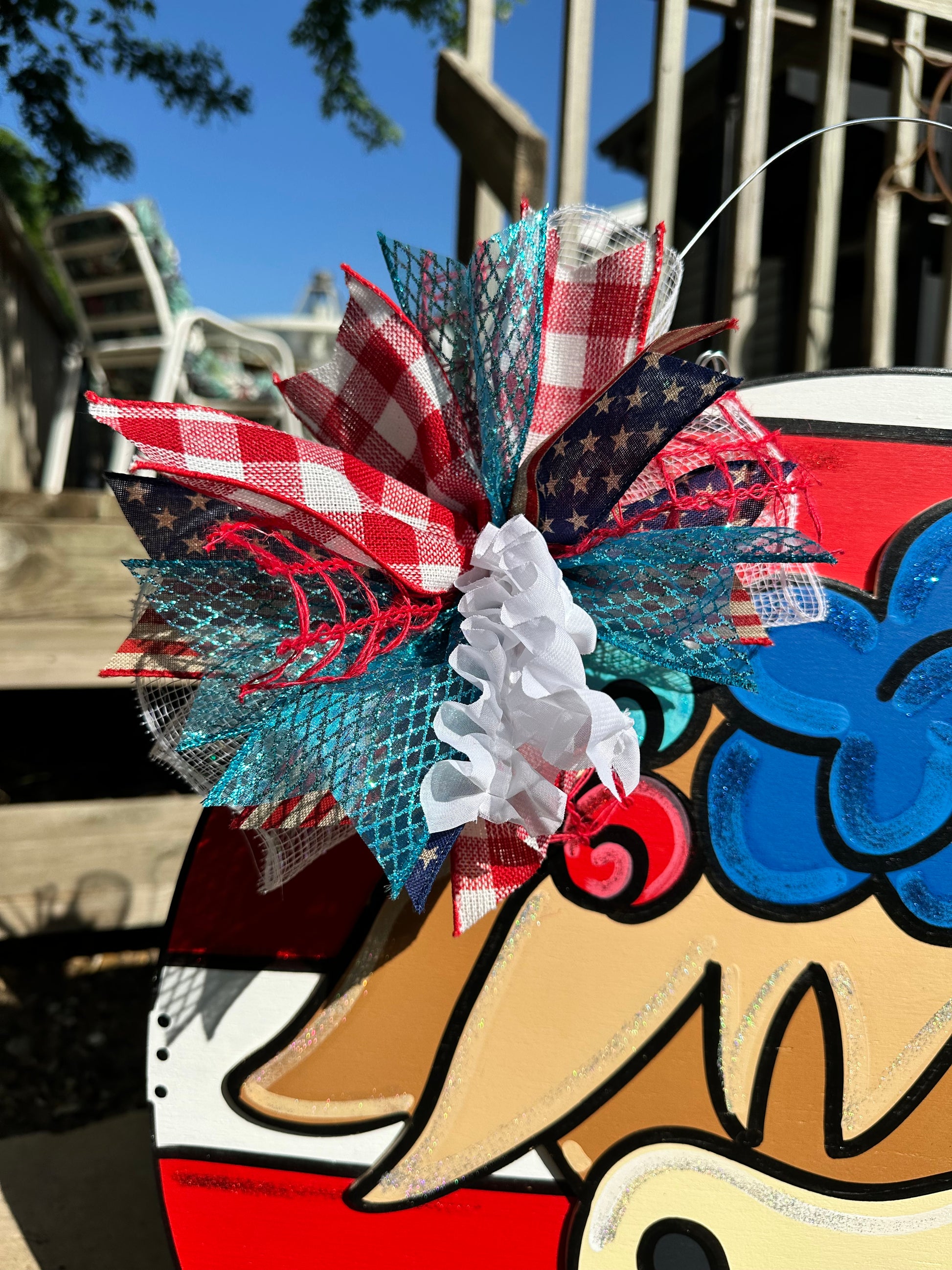 Our door hangers are cut out of 1/4 plywood with a jig saw. We then go in and sand all the edges to smooth them out. We will then paint with our acrylic paints, and add any final details. After that, we will go in and seal the door hanger to prevent chipping, fading, yellowing or peeling. We will then go in and add the wire to the door hanger and accessorize with a cute bow and or beads to match!
