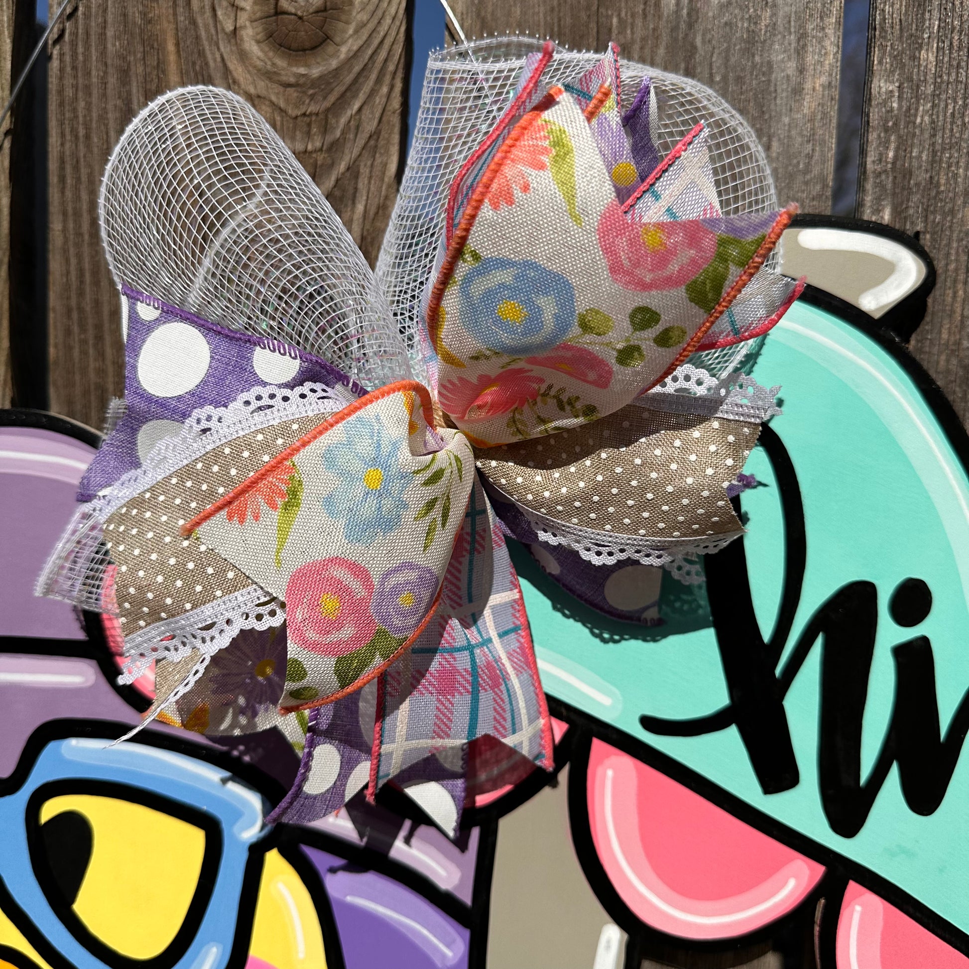 Our door hangers are cut out of 1/4 plywood with a jig saw. We then go in and sand all the edges to smooth them out. We will then paint with our acrylic paints, and add any final details. After that, we will go in and seal the door hanger to prevent chipping, fading, yellowing or peeling. We will then go in and add the wire to the door hanger and accessorize with a cute bow and or beads to match!